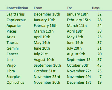 The tropical zodiac computes the sun in 1 of 12 zones around the earth. Each of the 12 has an angular length of 30°. 12 X 30° = 360°. The frame of reference for these zones is the sun’s position relative to the earth’s horizon. None of these signs are related to the group of stars that can be seen in the skies with one's physical eyes. In other words, it has nothing to do with reality, just an arbitrary division of the sky into 12 zones. Why is it important to have 12 zones? Babylonian astrology was the first organized system of astrology, arising in the second millennium BC. At that time, they were working with a calendar that was divided into 12 months. 13 constellations did not fit into that calendar, so they simply discarded the constellation Ophiuchus. The ancient Sumerian calendar divided a year into 12 lunar months of 29 or 30 days. Each month began with the sighting of a new moon. Thus, their astrology was arrived at by dividing the sky into twelve constellations with a measurement of 30° to each division. Leading astrological proponents also correctly point out that newspaper horoscopes and popular astrology magazines have little to do with serious tropical or Shamanic astrology, and that casting your horoscope is much more complicated than typing your date and place of birth into a website, that it takes into account many different bits of data that must be precisely entered into the calculation. It is beyond belief that one-twelfth of the world’s population is having the same kind of day. But serious Shamanic astrologers do not subscribe to such simplified notions.