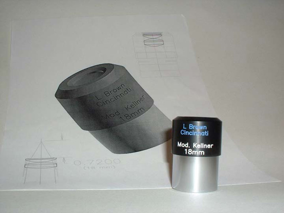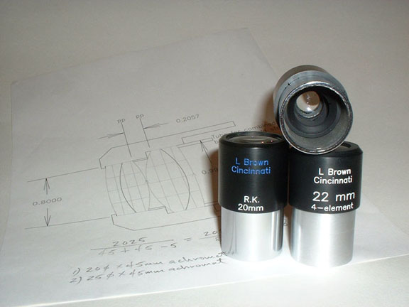 I experimented with a variety of eyepiece designs and eventually produced a set composed of five Plossls, three modified Kellners, one Erfle, one experimental four-element of my own design, and one orthoscopic. (Not shown here are the two-inch eyepieces). Each of these designs is discussed below.