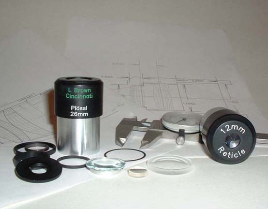 A good pair of calipers is necessary to measure the rings and spacers used to hold the lenses in place. A drop of superglue permanently bonds the urethane. The reticle eyepiece uses a glass military reticle held at the focal point, so that the etched lines are in focus. Each eyepiece was finished off with a field stop which sharply defines the apparant field of view. If the edges of the field of an eyepiece start to distort the image, a smaller field stop eliminates the bad area. You could probably enlarge the apparant field of view of any eyepiece by removing the field stop, but you would probably pick up some edge distortion. Also, the image would appear to fade away at the edges instead of being sharply defined. I did this intentionally in some of my ultra-wide angle eyepieces since it helps increase the "space-walk" effect. The effect is so impressive that I can live with a little distortion.