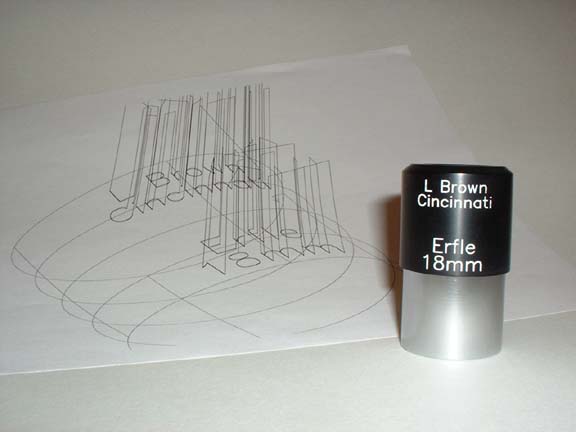 All of my eyepiece designs were first constructed in virtual reality in SurfCam or SolidWorks, three-dimensional surface and solid modeling programs. I used Surfcam to project text onto a cylindrical surface and posted the file to an NC machine which cut the text into the black barrel. I then sprayed paint over the black urethane barrel and sanded off everything that was not down in the carved grooves, leaving a finished product that looks like it came from a factory in Japan. Talk about overkill! But it was fun.